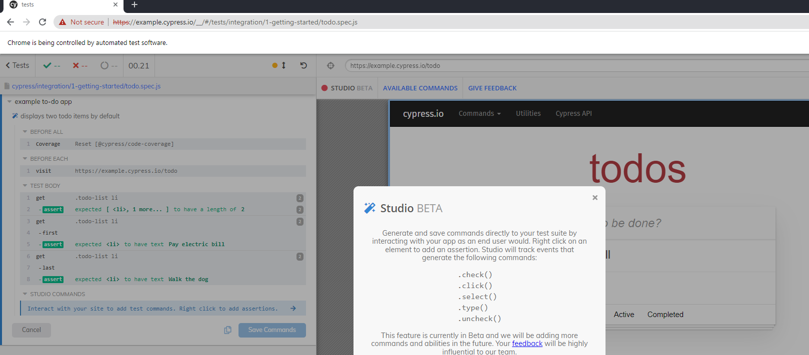 As you can see from the above screenshot, once the Cypress Studio is enabled, editing a test step triggers the Cypress Studio button where you can add new commands to you test. As of now, 5 main test commands are supported by the tool – Check, Click, Select, Type, and Uncheck.