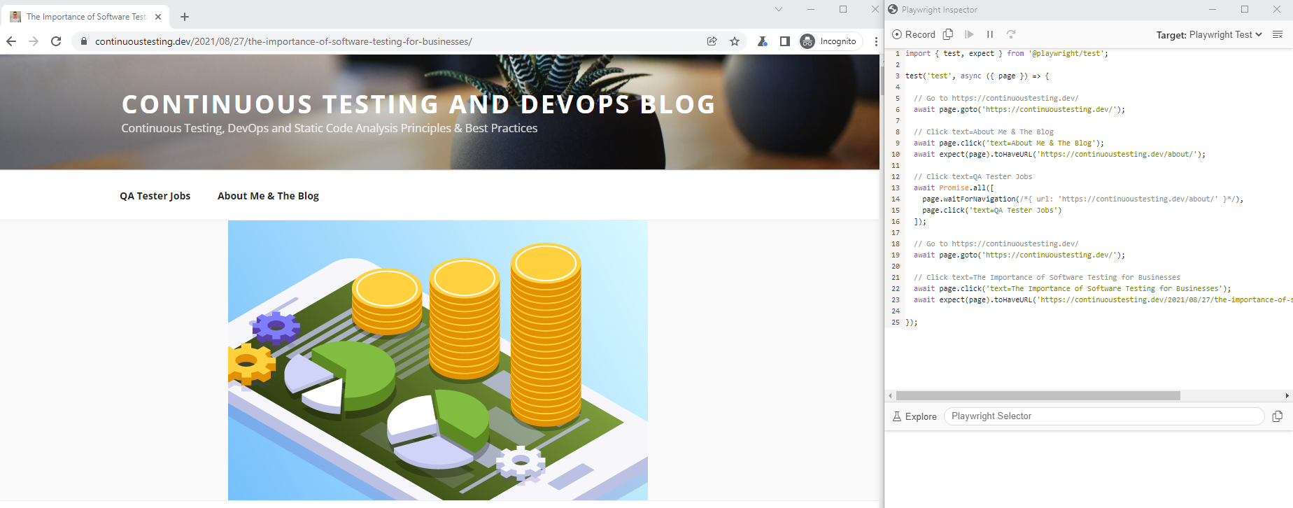 As you can see in the above recorded test code, it navigates to my blog webpage and performs some basic navigation and clicks on different links and menus. The generated code can than be exported and saved in different language bindings including the native Playwright Test, Java, JavaScript, Python, and C#.