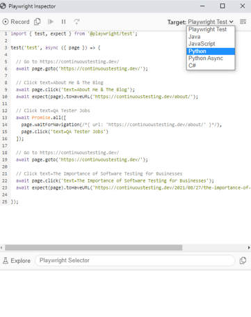 Another cool feature of the Playwright CodeGen tool is the Explore button. This capability enables developers to mouse hover the web application under tests and inspect the elements via the Playwright Selector. When selecting an element from the tool you can than copy it into your IDE test code and proceed with your test creation. In addition, you can record, than stop, and continue recording few times as long as the tool is still running. Lastly, you can do basic debugging of your recorded test from the Playwright Inspector CodeGen tool through stepping over, execution stop and more.